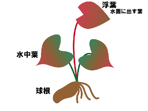 右の図は葉をつけたものですが、球根、根、水中葉、浮葉に分ける事が出来ます。